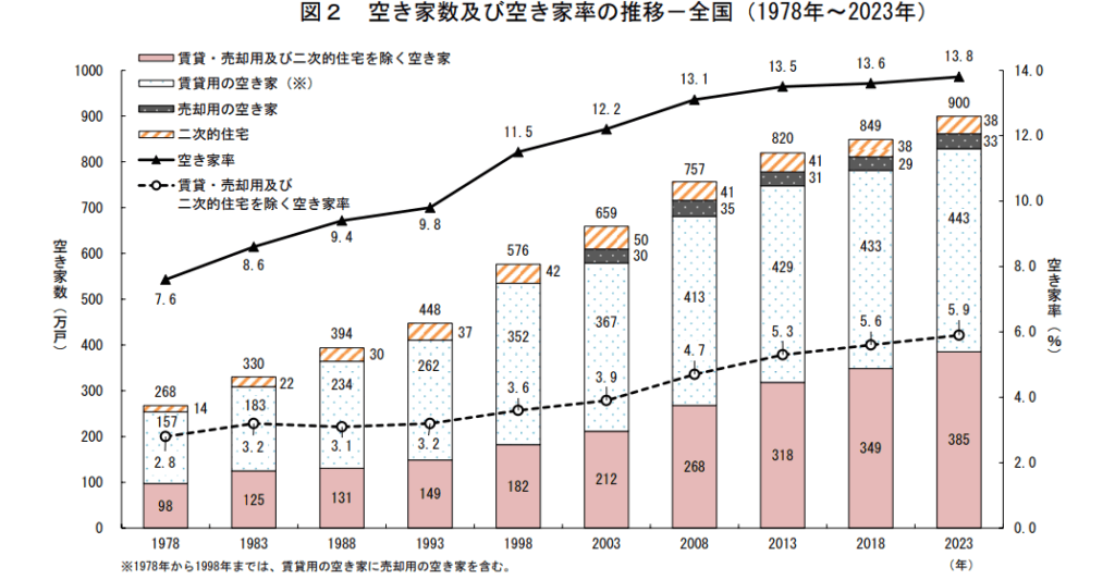 総務省の調査によると、全国の空き家は令和5年時点で約900万戸、空き家率13.8%と過去最多を記録。今後も増加が見込まれています。