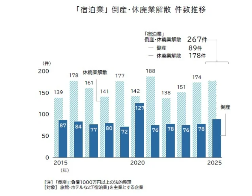 帝国データバンクが2026年2月に発表した調査によると、2025年の宿泊業の退出は267件でした。