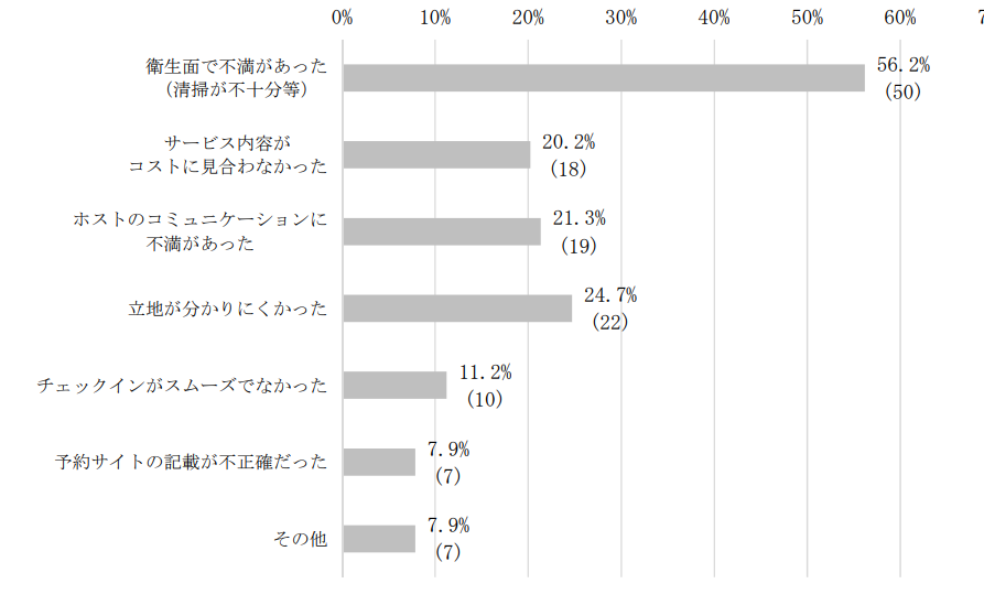 清掃が不十分だとゲストの満足度が大きく下がります。観光庁の調査でも、宿泊中に「困ったことや不満だったこと」のうち、50%以上が「衛生面への不満」を挙げています。