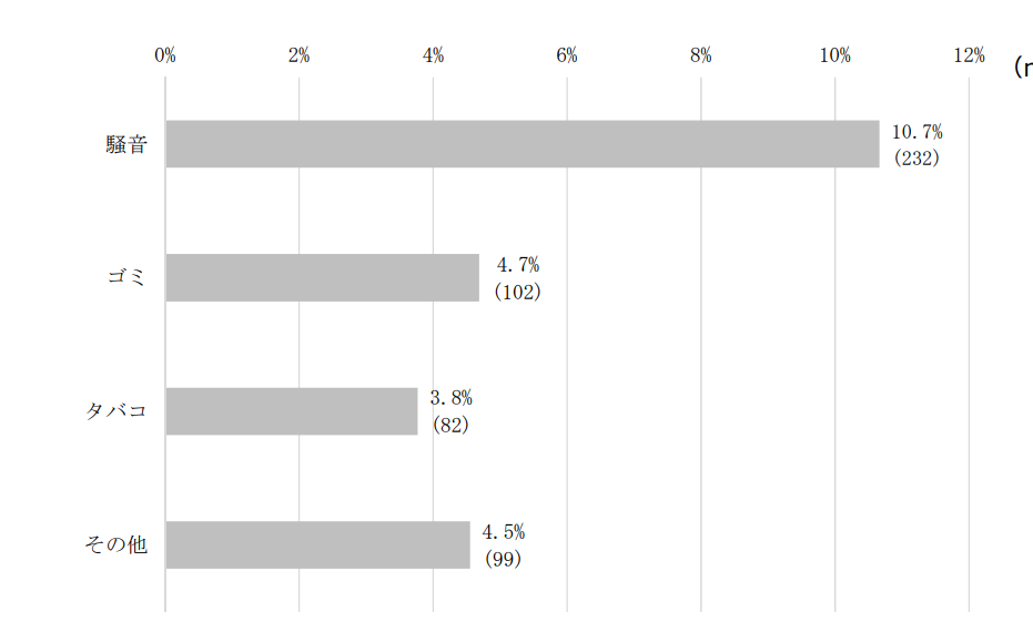 宿泊客による喫煙マナーの違反をめぐり、近隣住民とトラブルになることも少なくありません。観光庁の調査によると、「タバコのポイ捨て」など喫煙に関する苦情は全体の3.8%を占めました。