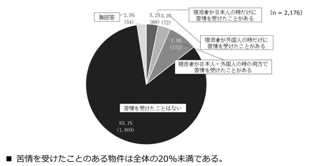 2022年の観光庁の調査では、苦情を受けたことのある物件は全体の20%未満でした。割合でみるとそれほど多くは感じませんが、苦情の件数自体は急増しています。