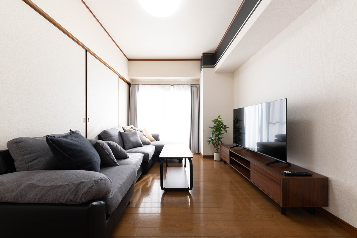 原状回復済みの状態から、家具家電の設置、インテリアコーディネート、民泊申請、消防審査を連携して進め、宿泊施設として運用を開始しました。
