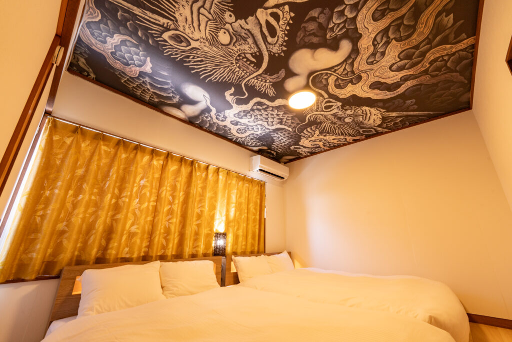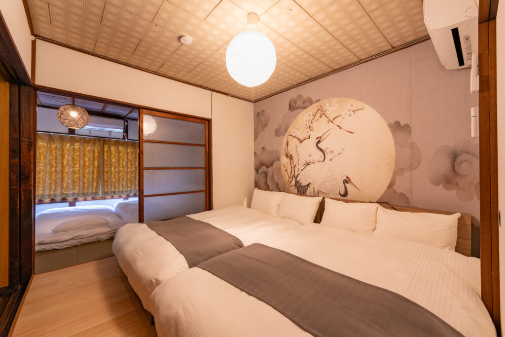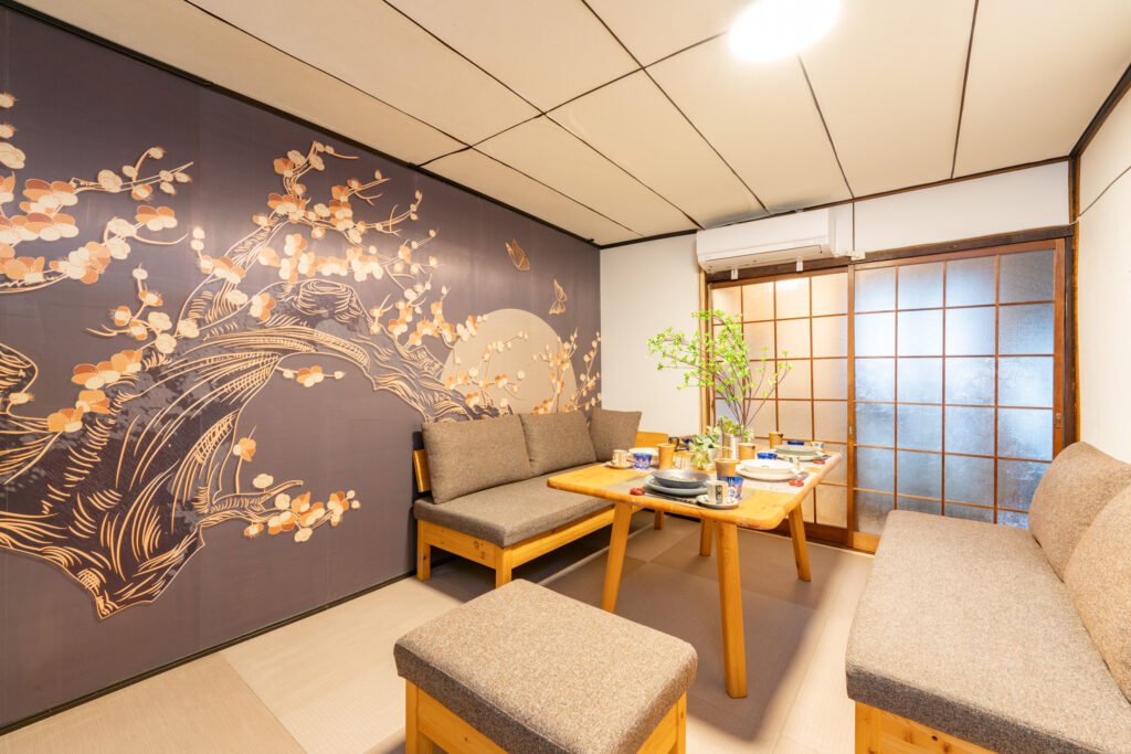 - 和の雰囲気を強調:壁や襖のデザインにこだわり、日本らしさを強調。